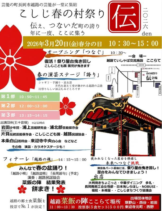2026年3月2日 こしじ春の村祭り 伝 2026年3月20日(金) ~ 場所:越路ていしゃば交流施設ここらて 越路ていしゃば交流施設ここらての詳細はこちら こしじ春の村祭り-伝ーが、今年も越路の春を連れてやってきます! 今回も越路の伝統芸能に加え、小千谷市片貝地区とのコラボや、 「越路菜飯の陣」「カラオケ・演芸大会」など企画も盛りだくさん! どうぞお楽しみに!