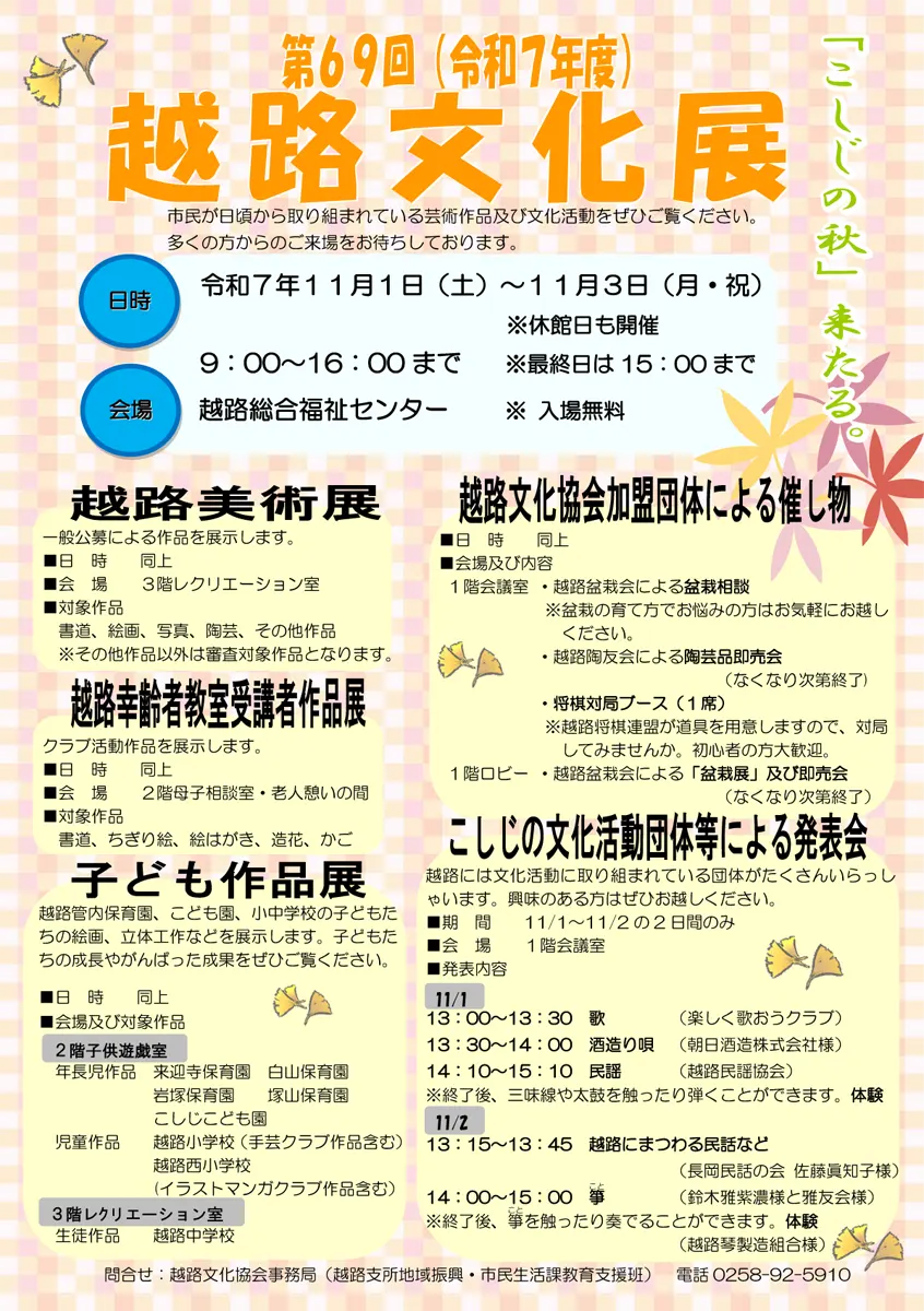 | お問い合わせ | 越路文化協会事務局(越路支所地域振興・市民生活課教育支援班) 電話 0258-92-5910 |