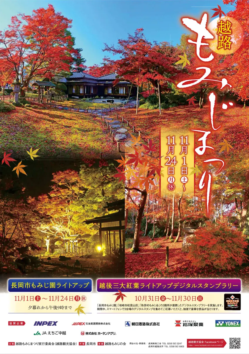 | 日程 | 2025/11/1(土)~11/24(月・休) 長岡市もみじ園ライトアップ 夕暮れから21:00まで |
