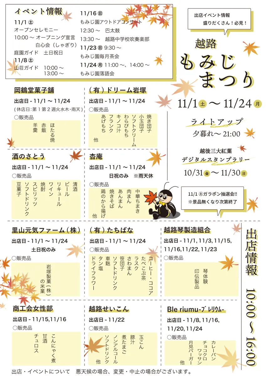 | 内容 | 11/1(土) オープンセレモニー 10:00~ オープニング宣言・白心会(しゃぎり) 庭園ガイド 11/1~11/24(土日祝日) 11/8(土) 山荘ガイド 10:00~ 13:00~ 11/16(日) もみじ園アウトドアコンサート 12:30~ 巴太鼓 13:30~ 越路中学校吹奏楽部 11/23(日) 9:30~もみじ園毎月茶会 11/24(月) もみじ園落語会 |